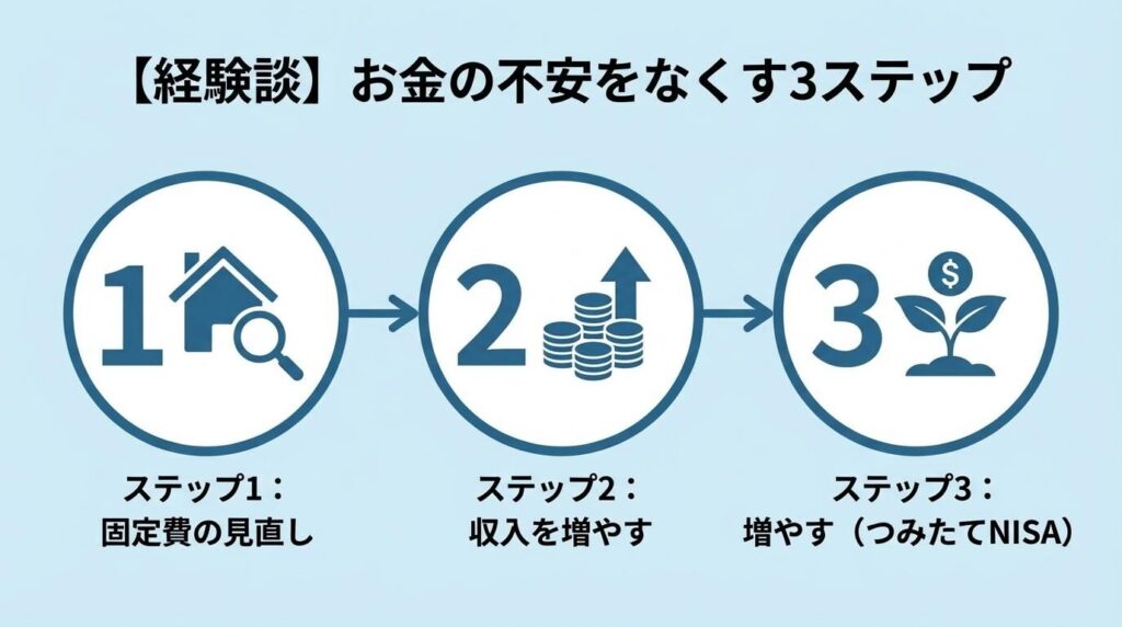 そこでお金の不安をなくしたいパパママ向けに、ボクが実行した3ステップを紹介します。